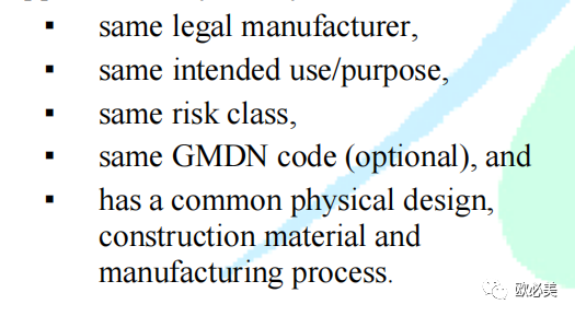 “医疗器械家族”的概念代表由同一医疗器械制造商生产的一组医疗器械,前提是所有器械都是同一时间,但具有不同的形状和特征。同时,这些设备也应具有相同的预期用途。为了被允许应用这种方法,申请人应确保满足以下所有标准——进行分组的医疗器械应: