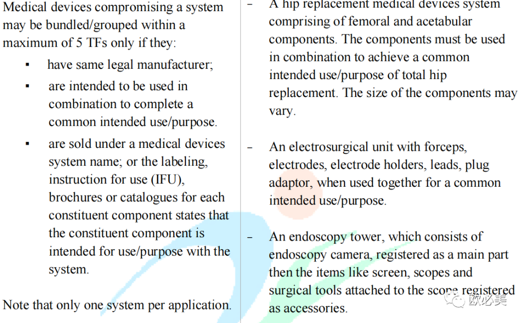 根据目前的SFDA指南,“医疗器械系统”包括多个组成部分,以完成共同的预期目的。为了符合资格,医疗器械系统应具有相同的制造商,并且最初旨在完成共同的预期目的。它也应该以一个通用名称投放市场,并贴上相应的标签。在申请医疗器械系统注册时,申请人应根据分配给最高级别组件的级别来确定级别。最初打算与系统内的设备一起使用的附件也可以在同一应用程序中注册。